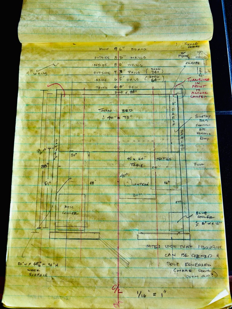 If it looks like my drawn to scale little camper cabin is drawn on parchment it’s because I started planning all of this last fall to see how it would fit and work in the bed of my 1989 F350 and paper has a way of getting crinkly and parchment-y with age (especially if you’re erasing and changing things as many times as I did)
